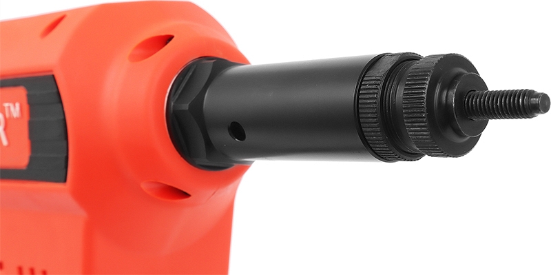 - Для накручивания заклепки на рабочий стержень достаточно коснуться края стержня: включится двигатель и самостоятельно накрутит заклепку