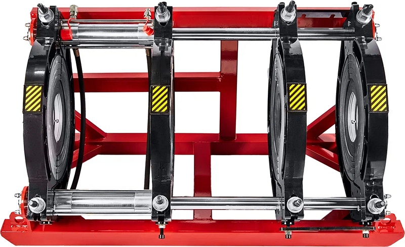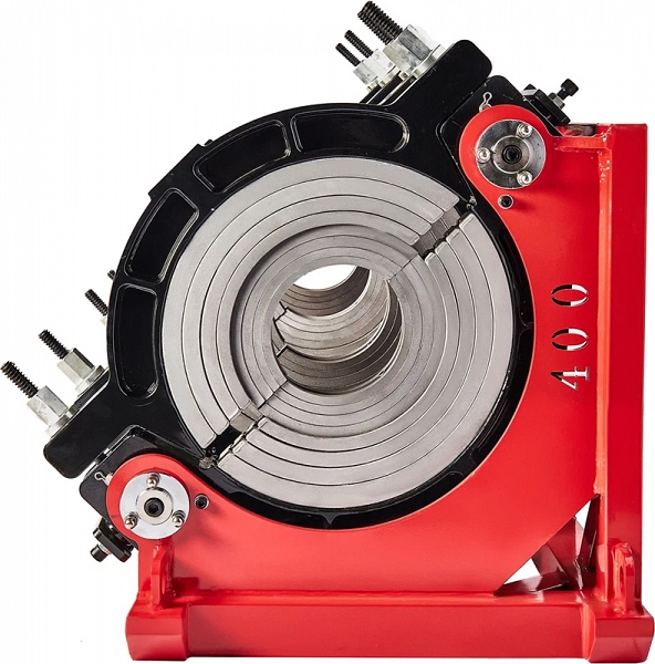 - Центраторо с гидравлическим приводом и 4-мя прочными широкими зажимами, один из которых легко может быть удален для облегчения сварки полимерных фитингов с трубами (тройники, крестовины, отводы), имеет большой запас прочности за счет качественного сплава и ребер жесткости, что позволяет сваривать полимерные трубы с любым показателем SDR